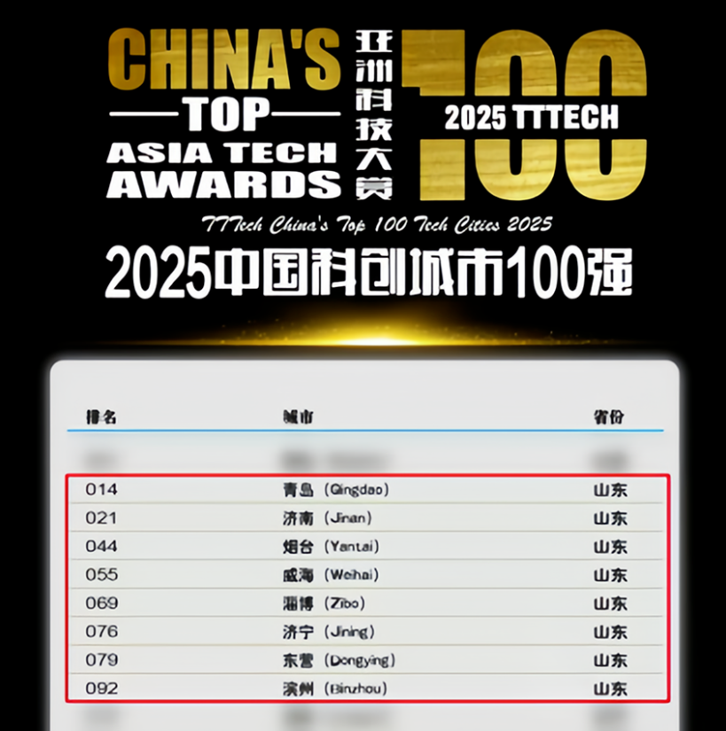 在2025年度TTTech中国科创城市100强榜单中,山东省表现亮眼,共有8个城市上榜,上榜总数位居全国省份第四,仅次于江苏、广东和浙江,彰显了山东作为中国经济大省向科创强省迈进的坚实步伐。