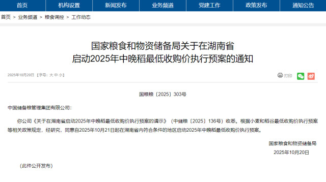 10月20日,国家粮食和物资储备局发布通知,根据小麦和稻谷最低收购价执行预案等相关政策规定,国家粮食和物资储备局同意中储粮自2025年10月21日起在湖南省内符合条件的地区启动2025年中晚稻最低收购价执行预案。