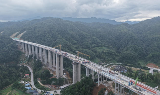 刀背冲大桥是项目关键控制性工程,全长408.9米,最高墩达87.729米,平均墩高49.18米。因受南山国家森林公园规划调整影响,项目二期用地直至2024年底才获批复。为此,建设单位及时调整方案,将原设计的悬臂现浇挂篮施工钢构桥优化为预制梁桥,为项目快速推进创造了条件。