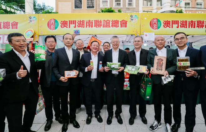 澳门台湾总商会会长陈忠勇,在澳门湖南联谊总会理事长叶惊涛等陪同下打卡总会展台。更令人动容的是,一批 00 后澳门湘籍代表主动化身 “湘味代言人”,他们热情洋溢地向身边亲友、澳门市民绘声绘色推介家乡好物。