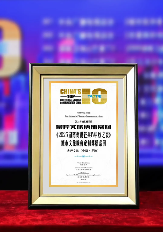 4月11日,第二届AT ASIA亚洲文旅大赏暨CC ASIA亚洲城市大赏2026在澳门威尼斯人金光会展中心举行。由长治市太行文化旅游集团有限公司(太行文旅集团)深度协同、湖南卫视 & 芒果 TV 出品的《2025 湖南卫视芒果 TV 中秋之夜》,从亚洲众多优秀文旅案例中强势突围,斩获2026 TAOTIE最佳文旅传播案例殊荣。