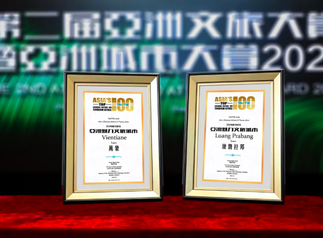 老挝旅游推广中心(中国)代表登台领取荣誉证书有千年佛韵的琅勃拉邦,有微笑从容的万象,还有便利快捷的中老铁路与友好开放的免签政策,这怎能不令四海游客心驰神往、奔赴而来?