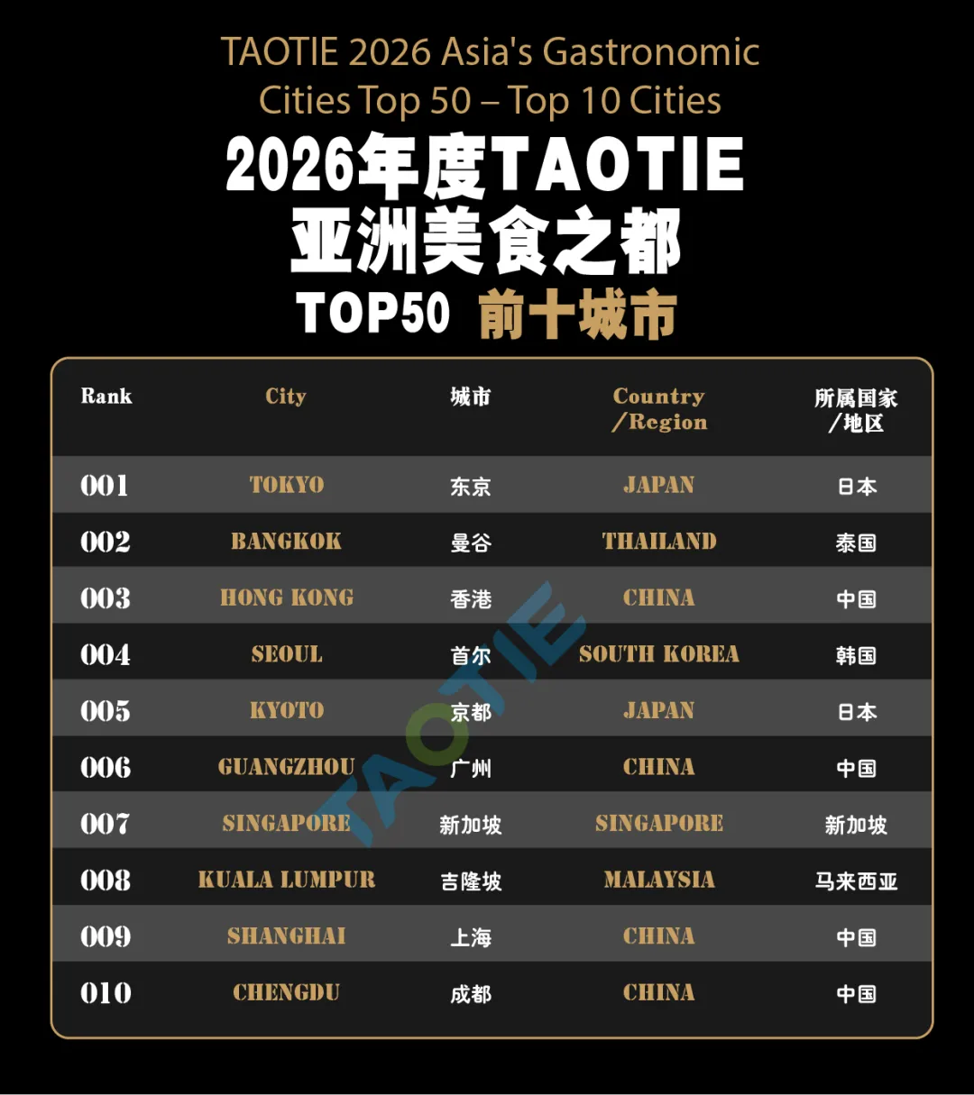 从这个角度看,2026年度《TAOTIE亚洲美食之都TOP50》榜单不仅是一份荣誉的陈列,更是一份投资和消费的风向标。中国以15席的压倒性优势领跑,日本的极致化打磨、印度的香料文化融合、东南亚的草根美食爆发,共同构成了亚洲美食版图的多元图景。而对文旅产业而言,榜单传递的信息同样清晰:谁能将地方风味转化为可识别的城市资产,谁就能在未来的区域竞争中占得先机。
