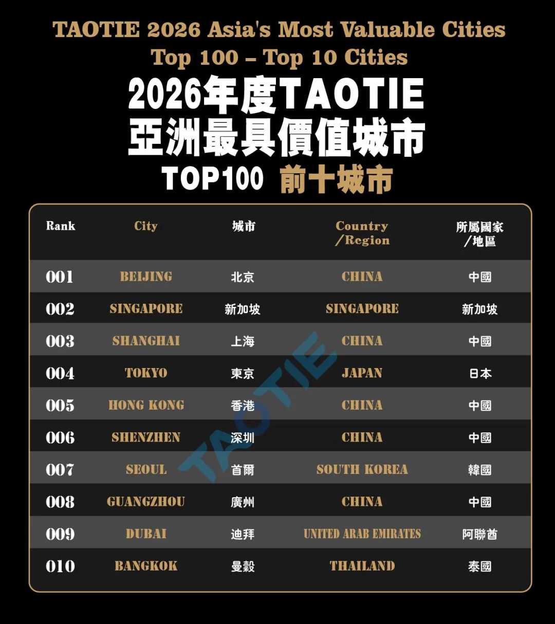 2026年度《TAOTIE亚洲最具价值城市百强榜》,表面上看是一份排名,本质上是对“什么是好城市”的一次重新定义。